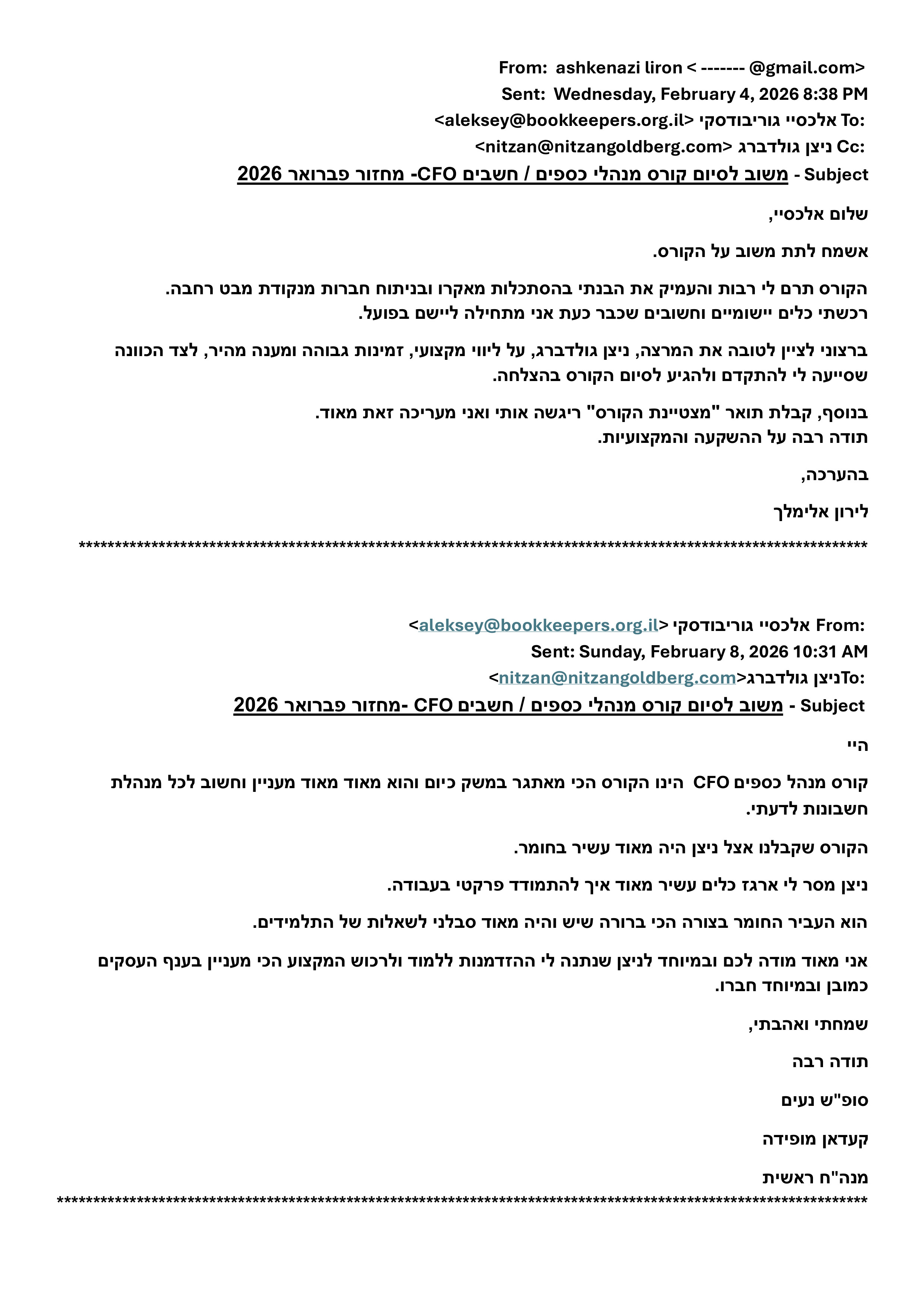 לחצו על ההמלצה לקריאה מעמיקה קורס מנהלי כספים CFO מקוון זום- המלצות אישיות עם סיום מחזור אוקטובר 2025- פברואר 2026 – 2/2 קורס מנהלי כספים CFO מקוון זום- המלצות אישיות עם סיום מחזור אוקטובר 2025- פברואר 2026 – 1/2 המלצה להרצאה בנושא מיסוי רכבים- מאיגוד קציני הבטיחות בתעבורה- בכנס השתלמות ארצי- 29/12/2026 קורס מנהלי כספים CFO מקוון בזום- המלצות אישיות עם סיום מחזור נובמבר 2024- מרץ 2025 קורס מנהלי כספים CFO מקוון בזום- המלצות אישיות עם סיום מחזור מרץ 2024- יולי 2024- 2/2 קורס מנהלי כספים CFO מקוון בזום- המלצות אישיות עם סיום מחזור מרץ 2024- יולי 2024- 1/2 קורס מנהלי כספים CFO- מקוון בזום המלצות אישיות ממחזור אוקטובר 2023- פברואר 2024 2/2 קורס מנהלי כספים CFO- מקוון בזום המלצות אישיות ממחזור אוקטובר 2023- פברואר 2024 1/2 קורס מנהלי כספים CFO – מקוון בזום המלצות אישיות ממחזור מרץ 2023- יולי 2023 קורס מנהלי כספים CFO- מקוון בזום המלצות אישיות ממחזור אוקטובר 2022- ינואר 2023 – 1/2 קורס מנהלי כספים CFO- מקוון בזום המלצות אישיות ממחזור אוקטובר 2022- ינואר 2023 – 2/2 קורס מנהלי כספים CFO- מקוון בזום המלצה אישית ממחזור אפריל 2022 – אוגוסט 2022 קורס מנהלי כספים – CFO מקוון בזום המלצה אישית ממחזור ינואר 2022- אפריל 2022 קורס מנהלי כספים – CFO מקוון בזום המלצה אישית ממחזור אוקטובר 21 – ינואר 22 קורס מנהלי כספים מקוון בזום- מיקבץ המלצות ממשתתפי/ות מחזור מרץ- יוני 2021 – 1/3 קורס מנהלי כספים מקוון בזום- מיקבץ המלצות ממשתתפי/ות מחזור מרץ- יוני 2021 – 2/3 קורס מנהלי כספים מקוון בזום- מיקבץ המלצות ממשתתפי/ות מחזור מרץ- יוני 2021 – 3/3 לשכת מנהלי חשבונות- קורס תקציב תזרים, המלצה אישית ממחזור אוקטובר 2019 מכללת מישלב – קורס מנהלי כספים – המלצה אישית 3- עם הסיום והגשת הפרוייקט האישי-מחזור יוני 2018 מכללת מישלב – קורס מנהלי כספים – המלצה אישית 2- עם הסיום והגשת הפרוייקט האישי-מחזור יוני 2018 מכללת מישלב – קורס מנהלי כספים – המלצה אישית 1- עם הסיום והגשת הפרוייקט האישי- מחזור יוני 2018 לשכת מנהלי החשבונות- תעודת הוקרה- למשובים מעולים בקורס בניית תקציב וניהול תזרים מזומנים – מאי 2017 "הקלה" שירותי כספים- המלצה – לקורס ניהול תקציב ותזרים, בלשכת מנהלי החשבונות- אפריל 2017 משרד התיירות- המלצה- לקורס ניהול צי רכב בכיר- ינואר 2016 חברת תרימה בע"מ המלצה- לסדנת תזרים בקורס העשרה פיננסית למנהלים מכון היצוא- יוני 2015 סטפאק בע"מ מקבוצת DS SMITH- המלצה- לסדנת גבייה אסטרטגית ונחושה- מכון הייצוא קורס מנהלי כספים במכללת מישלב- המלצה- משוב מסכם מהשטח עם סיום מחזור 10 תעמל מזרע אקלטרה- המלצה- השתלמות בנושא עדכונים חשבונאיים פיננסיים לסוף שנה בינת תקשורת מחשבים – המלצה – לסדנת חשיבה ניהולית חדשה בתקציב שנתי – מכון הייצוא קבוצת לובינסקי פיג'ו סיטרואן- המלצה- לסדנאות גבייה יעילה ונחושה בעת משבר מעבדות חי בע"מ- המלצה- לקורס העשרה פיננסית למנהלים ללא רקע חשבונאי- מכון הייצוא אלעד טכנולוגיות בע"מ- המלצה- עם סיום מחזור 8 בקורס מנהלי כספים- מכללת מישלב גרבוגרף ישראל בע"מ- המלצה- לסדנת גבייה האומץ לדרוש את המגיע – א.לשכות המסחר מגו אפק בע"מ- המלצה- לסדנת הערכות אפקטיבית לתום שנת המס פיאט סוכנות ס.מ.ל.ת- המלצה- לכנס מנהלי תחבורה השקת רכב חדש תוסף קומפאונדס- המלצה- לסדנה פנים ארגונית בנושא האומץ לגבות את המגיע לי
